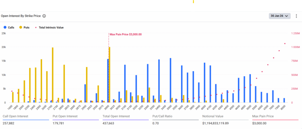 While Ethereum is trading below its $3,000 max pain level, before the January 30 options expiry showed a put/call ratio at 0.70, but over the last 24 hours, Ethereum put volume has climbed higher than call volume, and the put/call ratio is 1.79 at the time of writing, which signals bearish sentiment.