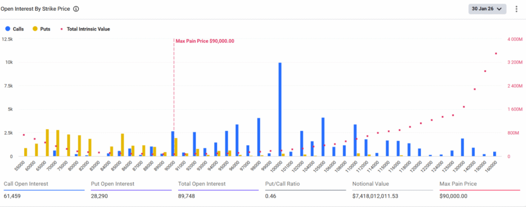 With that, Bitcoin’s put/call ratio was at 0.46, indicating a higher number of call options compared to puts. After that, currently, the 24-hour put/call ratio stands at 1.35, which indicates the downward sentiment after the wider market decline. Meanwhile, the max pain price stands at $90,000, suggesting that most options traders would face maximum losses, as per the data.