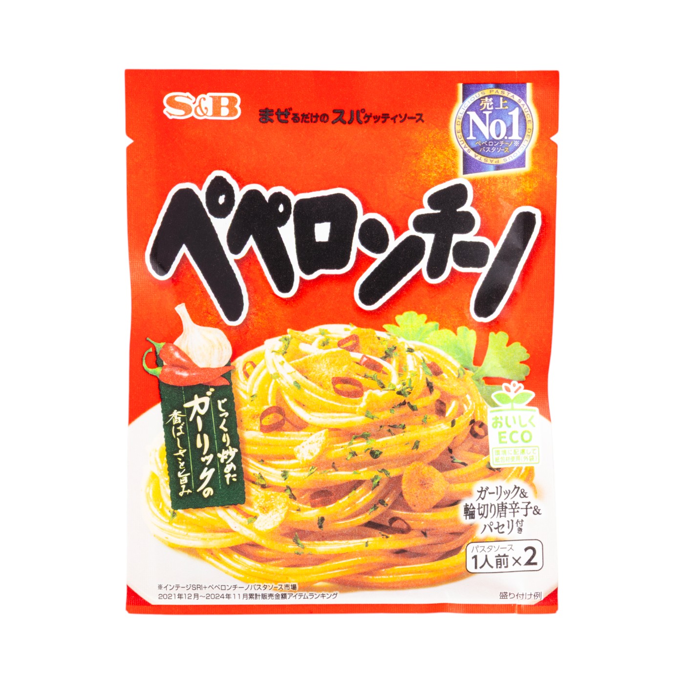 エスビー食品の「S&B まぜるだけのスパゲティソース ペペロンチーノ」は、香ばしいローストガーリックと唐辛子の辛みが特徴の市販パスタソースです。2食分が入っていて、ガーリック・輪切り唐辛子・パセリのトッピングが個包装で付属しています。