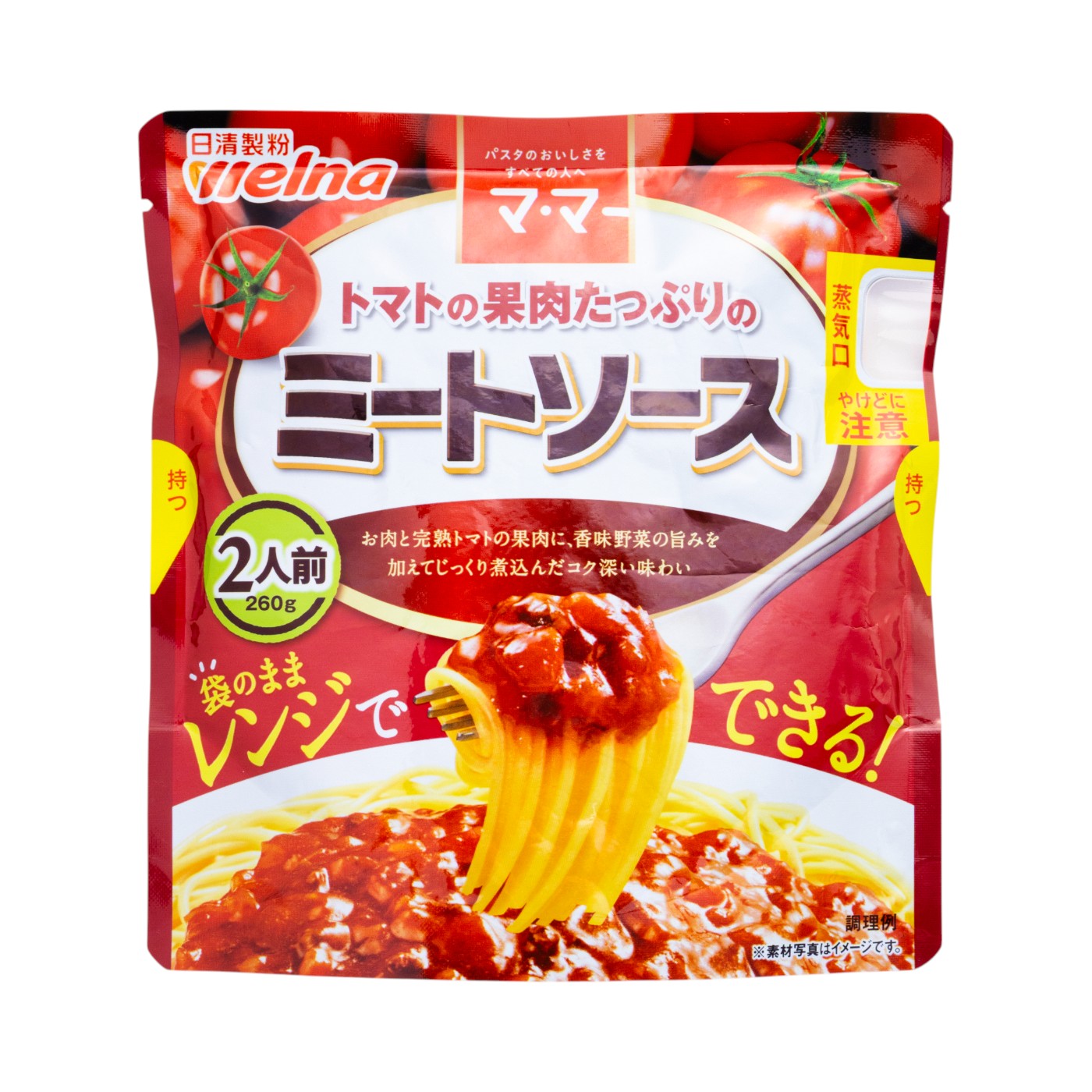 日清製粉ウェルナの「マ・マー トマトの果肉たっぷりのミートソース」は、香味野菜とお肉をじっくり煮込んだ定番の市販パスタソース。袋のまま電子レンジで温められる仕様で、完熟トマトの果肉の風味とコクが特徴です。1袋2人前入りなので、2人暮らしの家庭やたっぷり食べたい人に向いています。