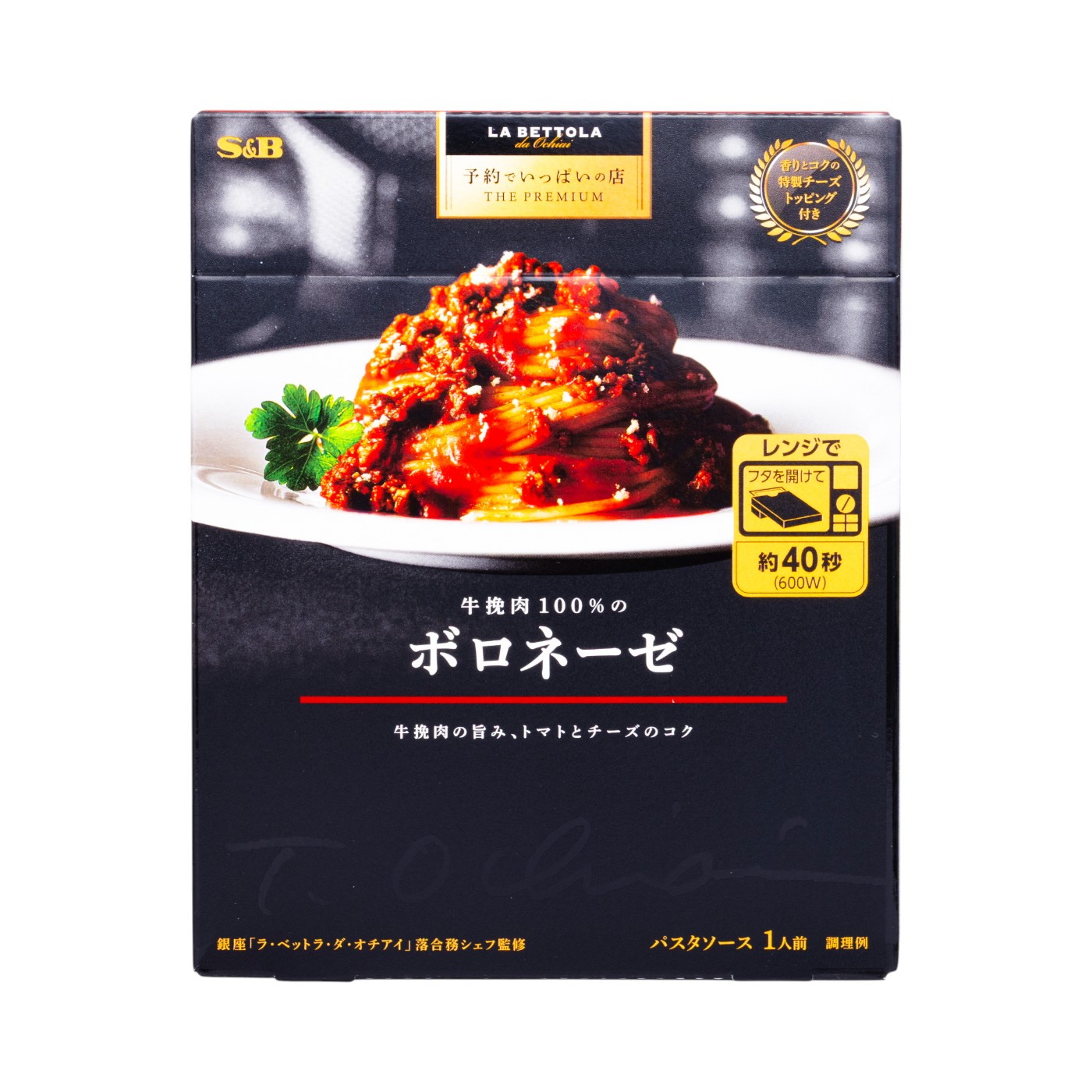 「S&B ラ・ベットラ 予約でいっぱいの店 THE PREMIUM 牛挽肉100%のボロネーゼ」は、エスビー食品が提供するプレミアムラインの市販パスタソースです。落合務シェフ監修による牛挽肉100%のボロネーゼソースに、特製チーズトッピングが付属しています。