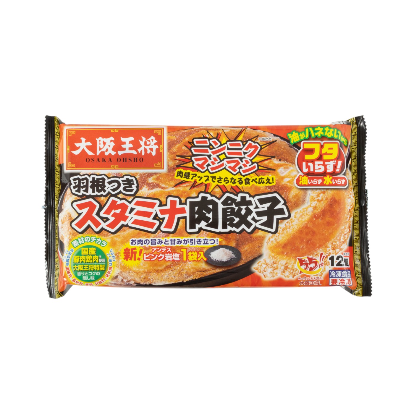 「大阪王将 羽根つきスタミナ肉餃子」はイートアンドが提供する冷凍餃子です。にんにくを強めに使用したスタミナ系の味わいが特徴で、調理は水・油・フタなしで可能。フライパン、ボイル、揚げの多様な調理方法に対応し、付属の塩で食べるのもおすすめです。