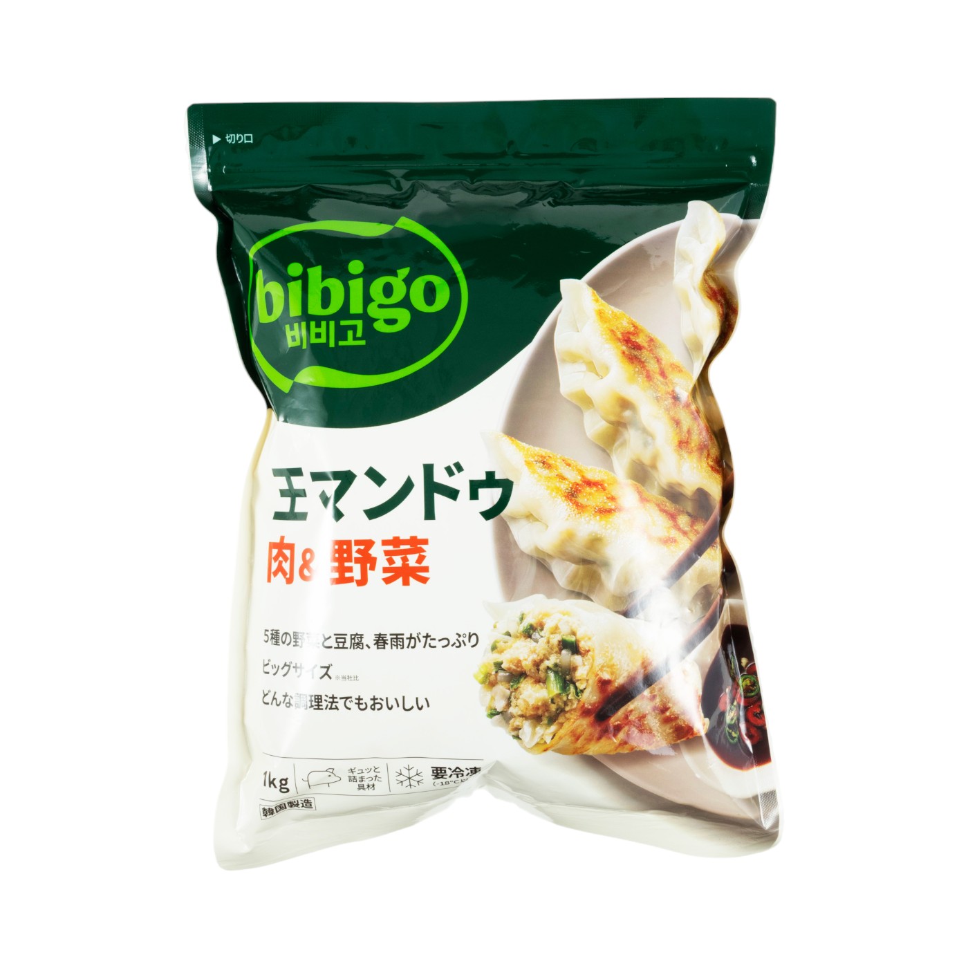 「bibigo 王餃子 肉&野菜」は、CJ FOODS JAPANが提供する韓国産の冷凍餃子です。1個約35gの大きめサイズで、豚肉と5種類の野菜、韓国春雨、豆腐を使用。1kgの内容量があり、焼き・蒸し・スープ・鍋など多様な調理方法に対応しています。大粒でボリューム感があり、韓国国内で高いシェアを持つブランドの主力商品です。