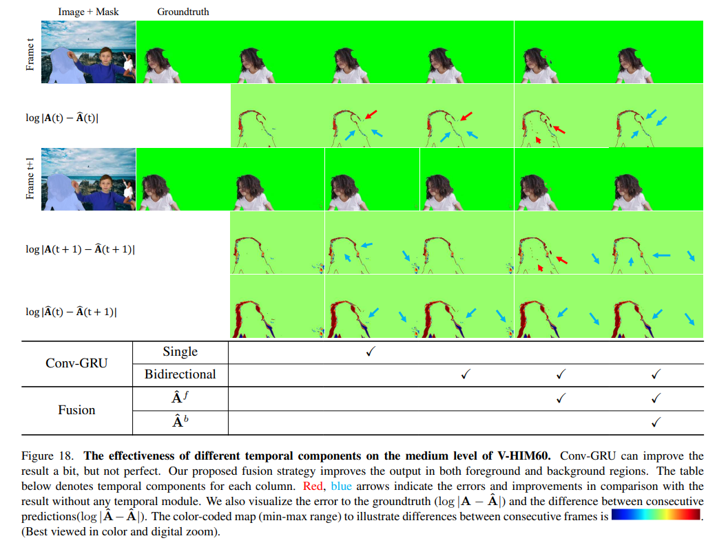 \ Table 15. Our framework also reduces the errors of trimap propagation baselines. When replacing those models’ matte decoders with ours, the number in all error metrics was reduced by a large margin. Gray rows denote the module from public weights without retraining on our V-HIM2K5 dataset.