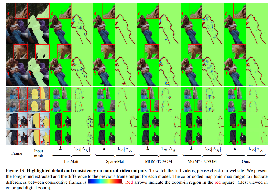 \ Regarding temporal consistency, SparseMat and our framework exhibit comparable results, but our model demonstrates more accurate outcomes. Notably, our output maintains a level of detail on par with InstMatt, while ensuring consistent alpha values across the video, particularly in background and foreground regions. This balance between detail preservation and temporal consistency highlights the advanced capabilities of our model in handling the complexities of video instance matting.