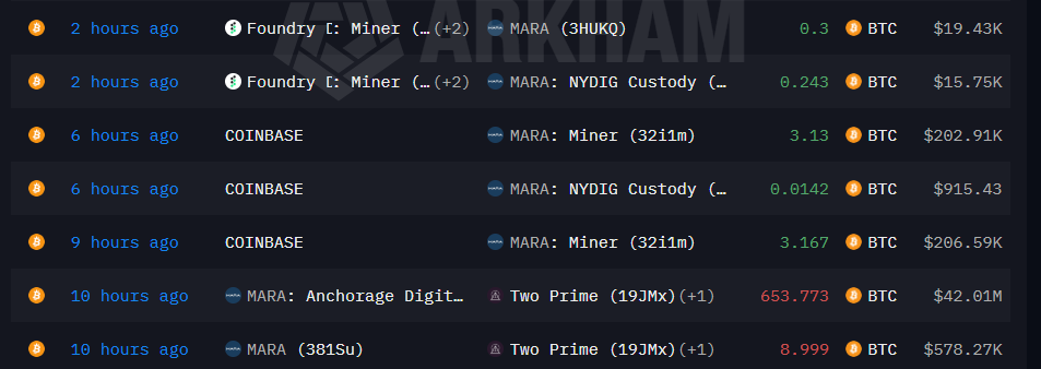 According to Arkham Intel’s blockchain analytics data, MARA Holdings had moved the largest amount of Bitcoin to the Two Prime; it transferred around 653.773 Bitcoin, which is worth around $42 million, and secondly, around 8.999 Bitcoin, which is worth around $578.27K, 10 hours ago.
