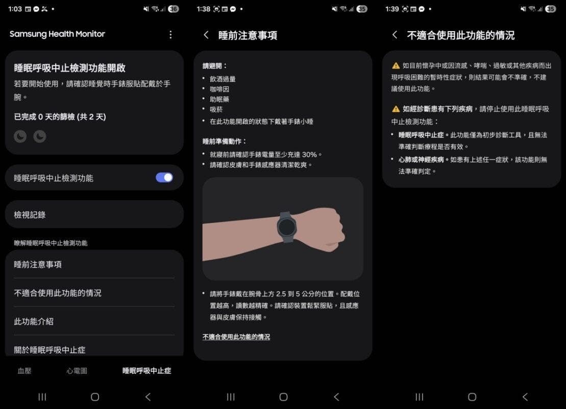 更重要的是,使用此功能時的睡眠時間至少在4小時以上,並且確保手錶能在睡眠過程服貼於手腕皮膚上 (另外也要記得開啟Samsung Health Monitor App的偵測功能)。