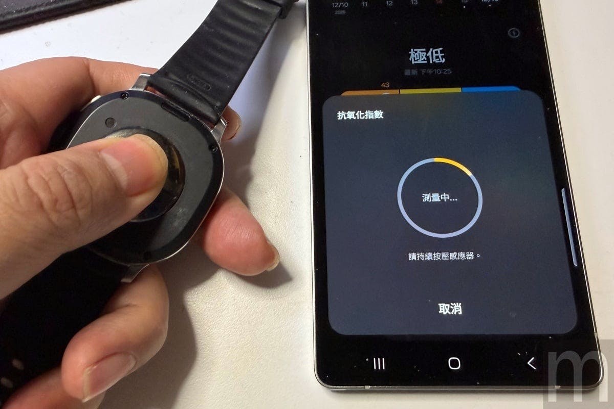 ▲進入Samsung Health App的抗氧化指數測量介面,再將大拇指輕輕放在Galaxy Watch錶款背面的光學感應器上,幾秒鐘時間就能得出數值結果