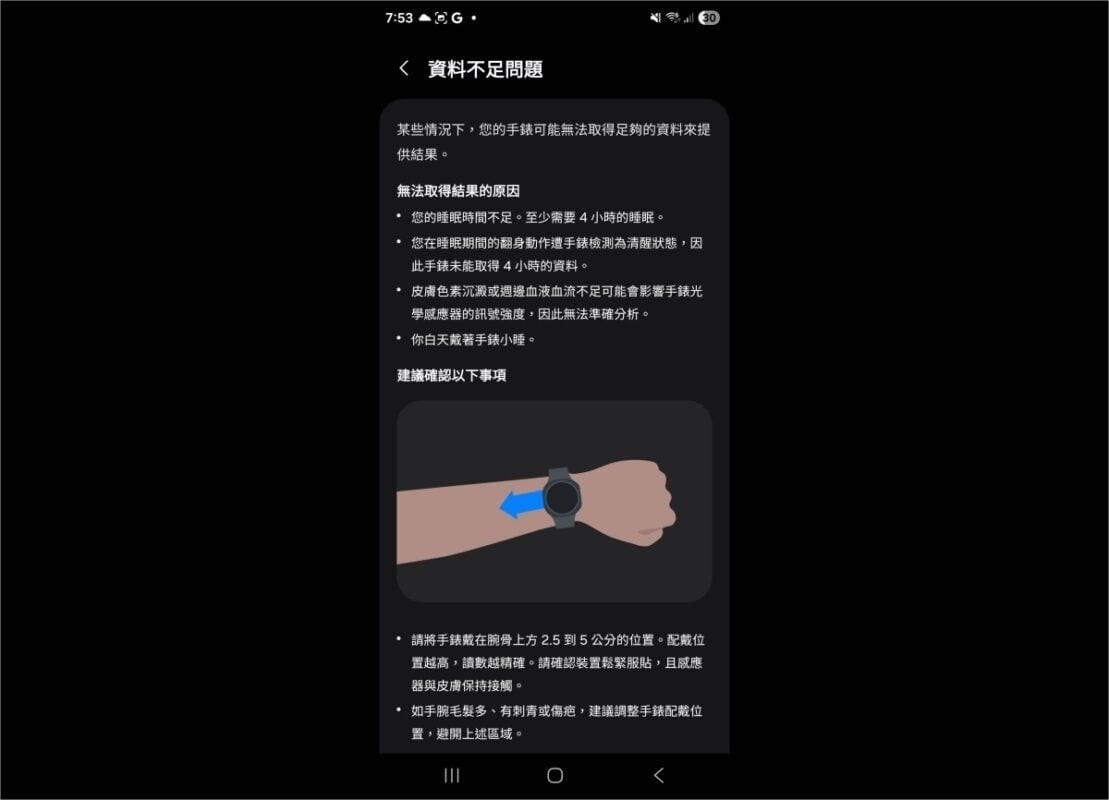 ▲若出現資料不足情況,可以重新調整手錶配戴方式,或是留意睡眠時間是否不夠,或是睡眠時有經常翻身等情況,甚至皮膚出現色素沈澱也會影響手錶判斷