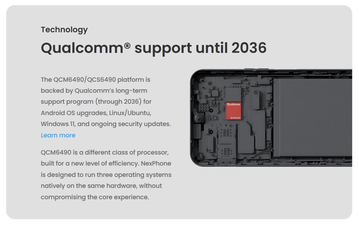 NexPhone並非採用常見的手機處理器,而是選用Dragonwing QCM6490平台,筆者推測重點應該是由於Dragonwing可提供比常規Snapdragon更少的限制,但架構本質相同且同樣支援完整的5G、Wi-Fi與藍牙功能,以及由於工業需求提供至2036年的長期支援,只是這款平台原本是鎖定像是工業強固平板電腦、POS、KIOSK、行車監控等物聯網裝置。