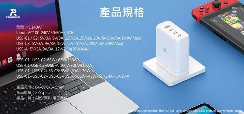 140W快充跳水價799元再送240W充電線 Powerrider快充支援1A3C輸出