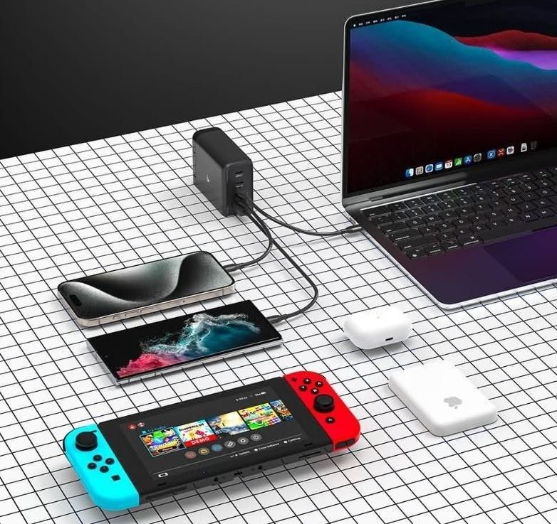 現在市面上主流的快充大多是65W居多,適合單獨幫單一耗電的裝置或是同時替2個一般裝置充電。而140W的快充最大優勢在於能夠同時幫2個耗電的裝置充電,像是2台MacBook Air或是Switch等裝置。充電時若只連接2個裝置,則每個USB Type-C輸出可達65W,幫多數筆電或遊戲充電不成問題。